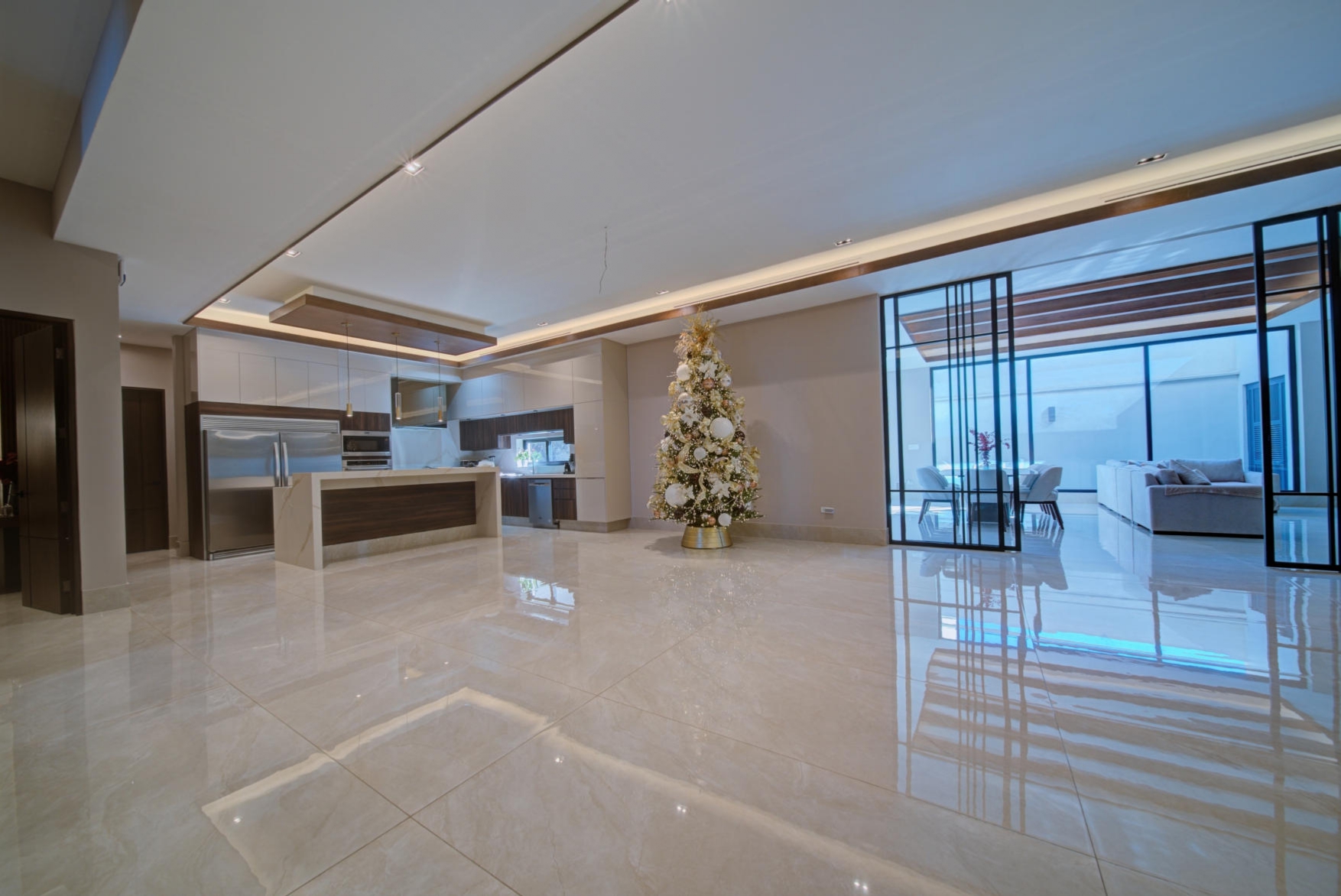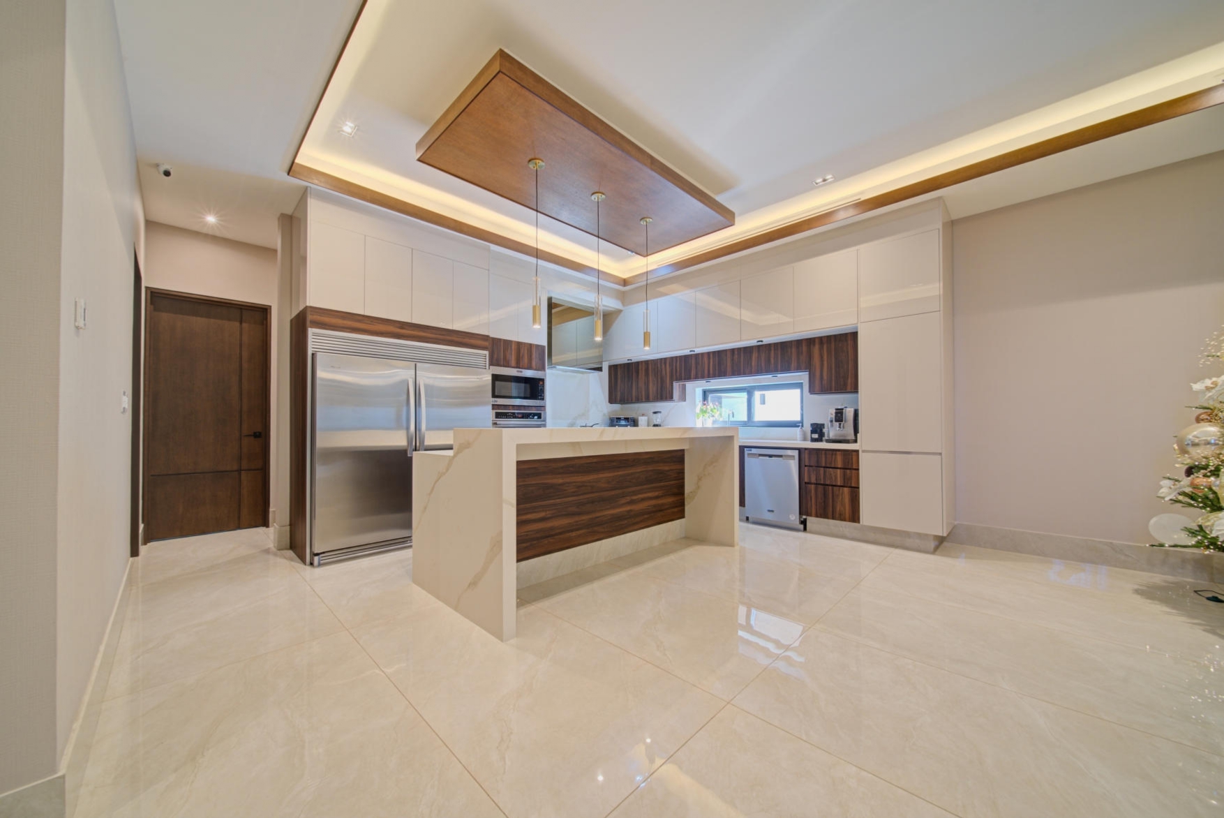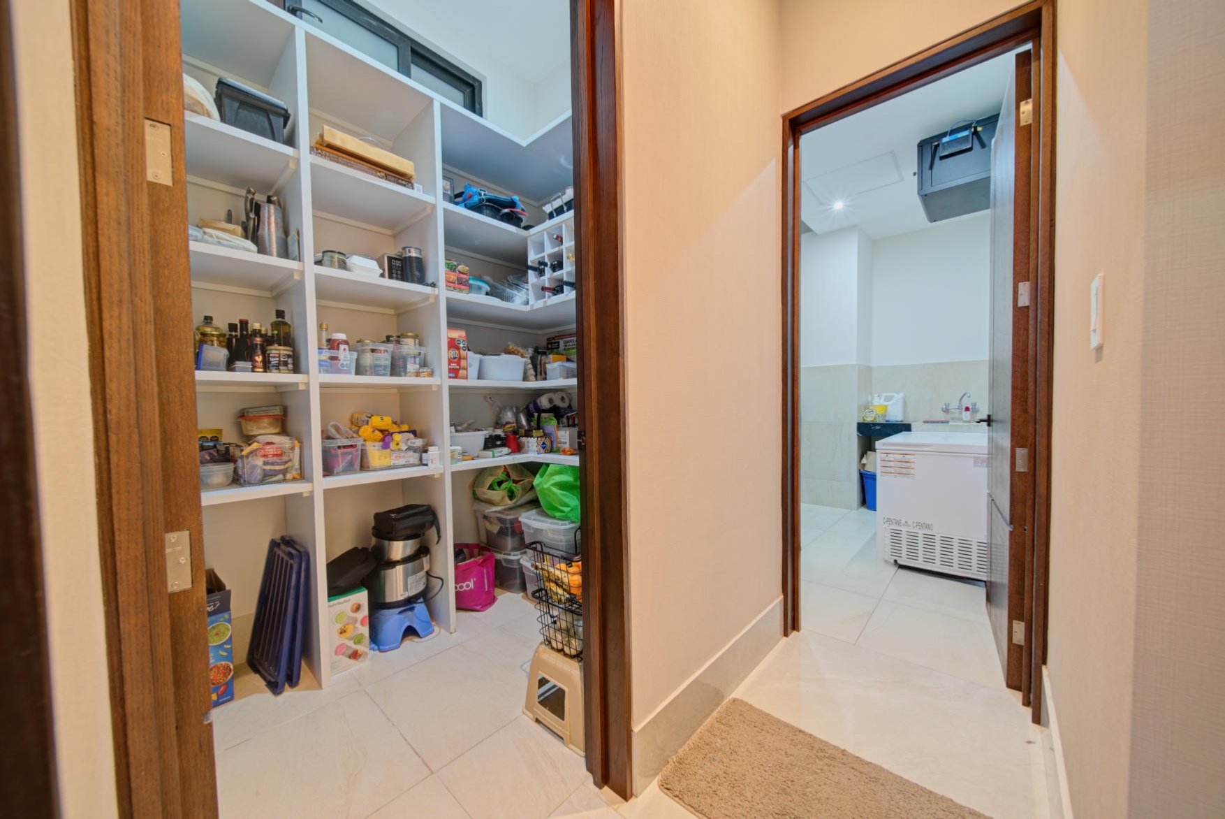Elegant open-concept fully equipped kitchen with high-end appliances and a dedicated pantry room