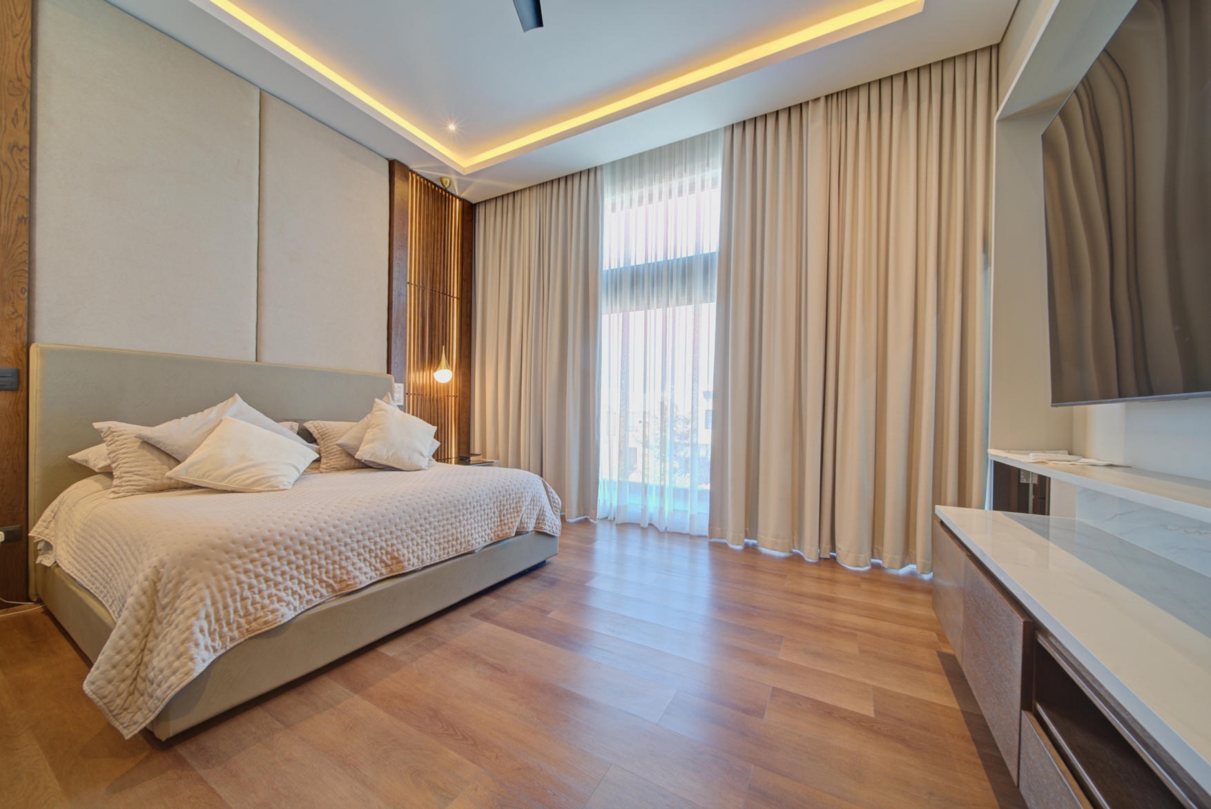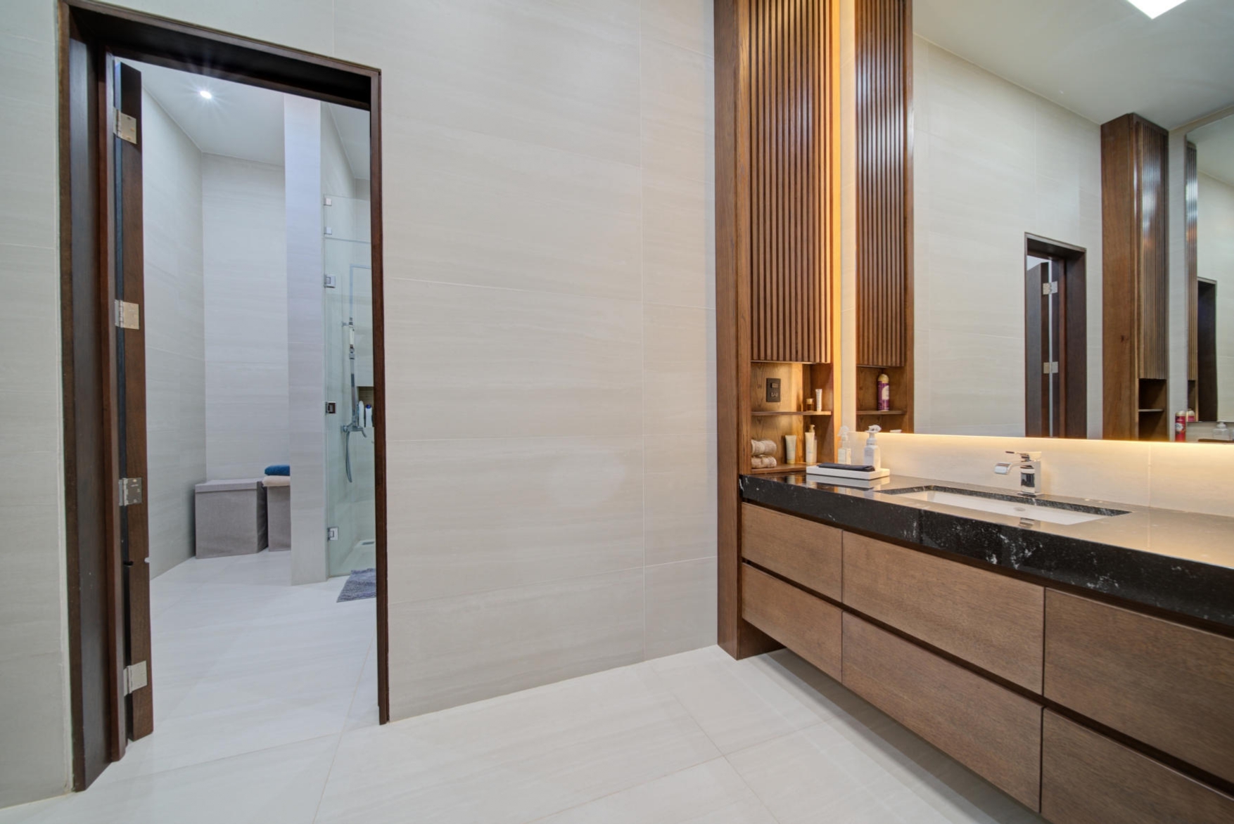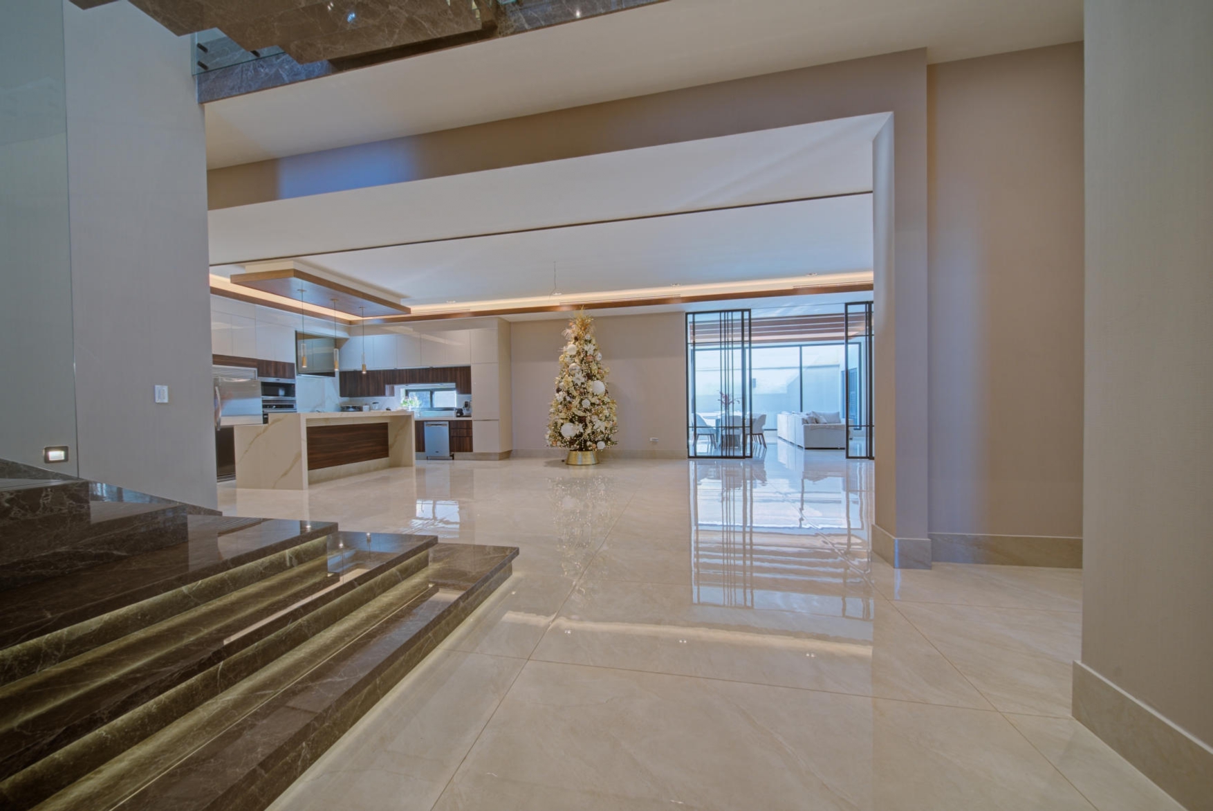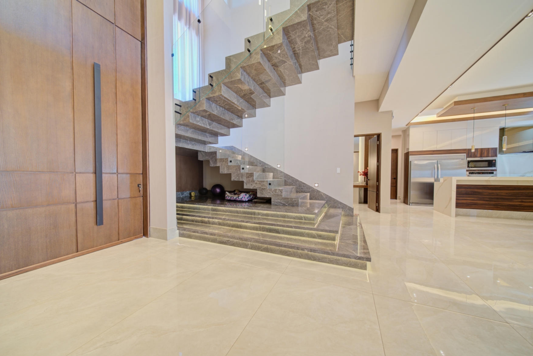 Elegant open-concept fully equipped kitchen with high-end appliances and a dedicated pantry room
