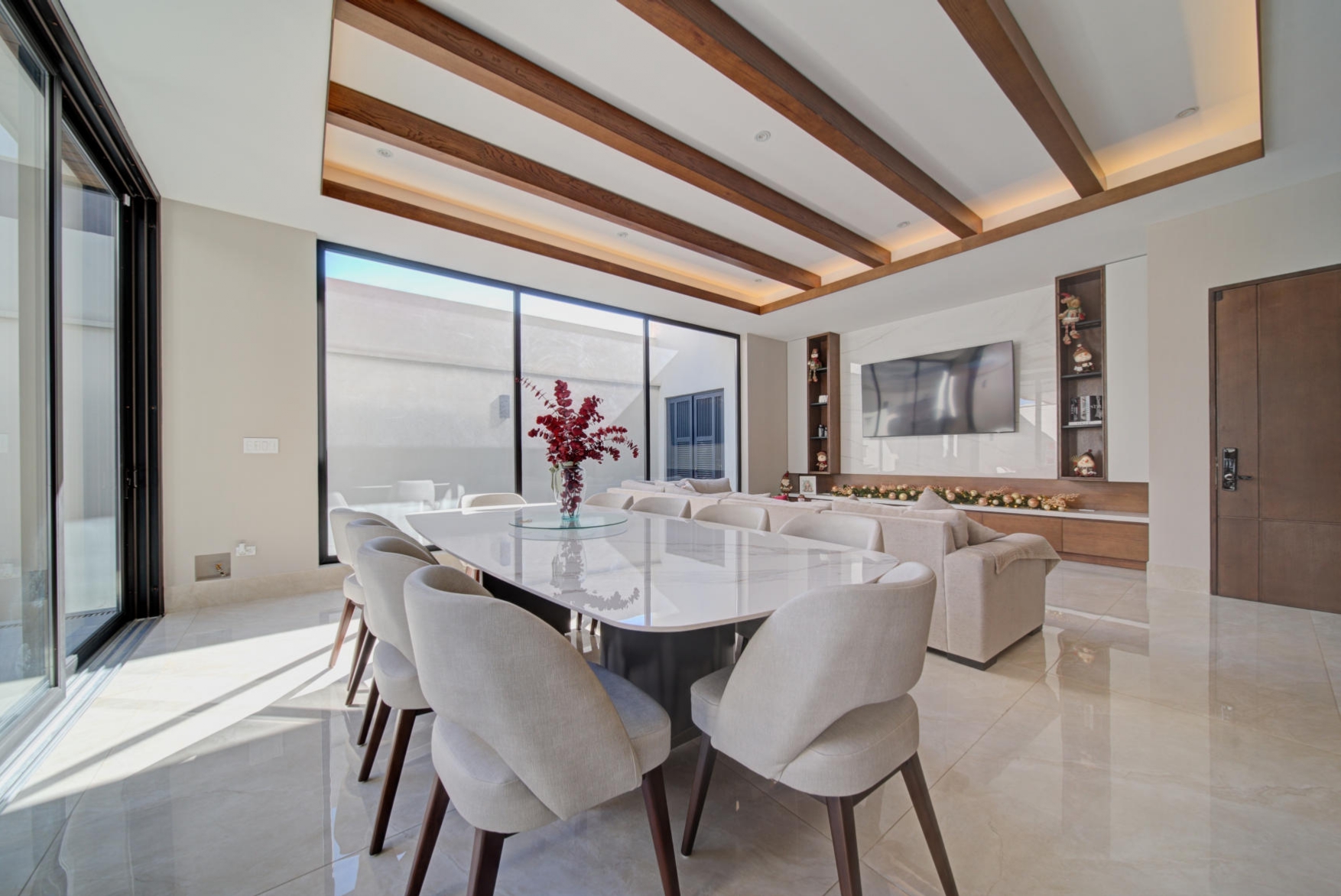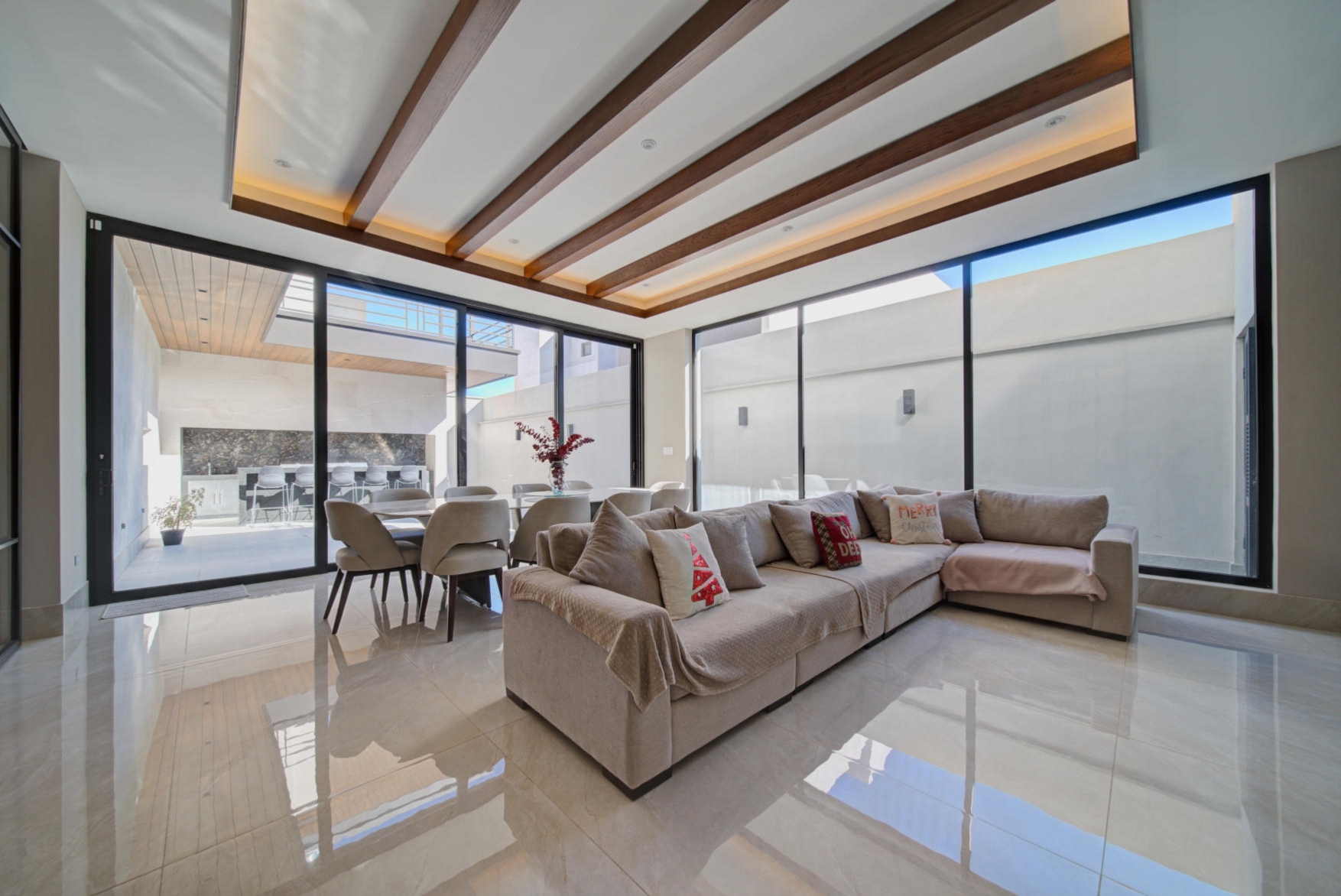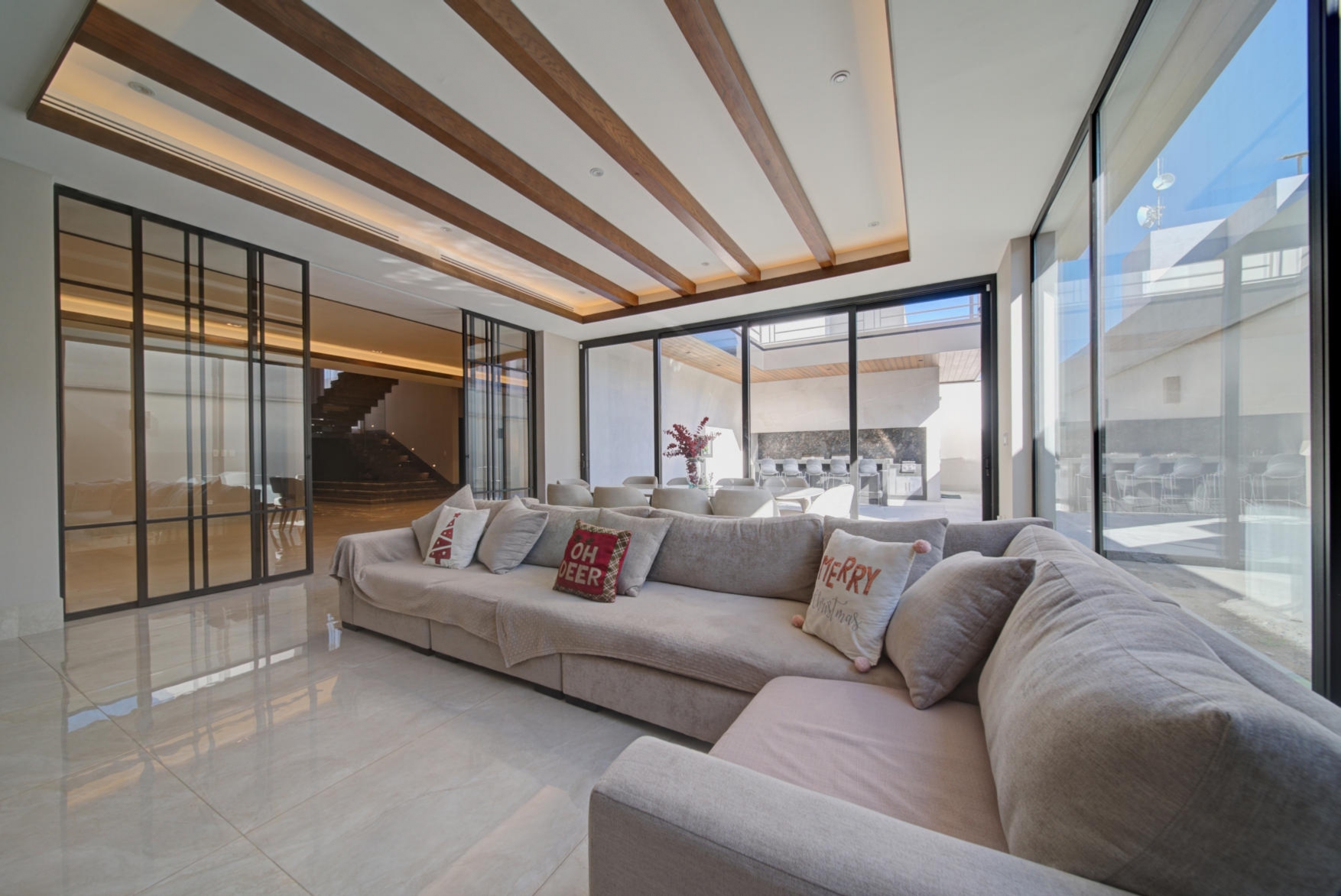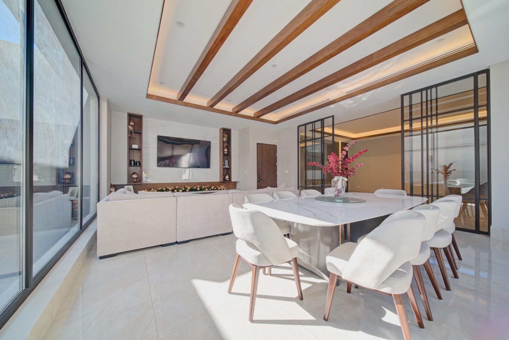 Sophisticated social area with panoramic glass windows