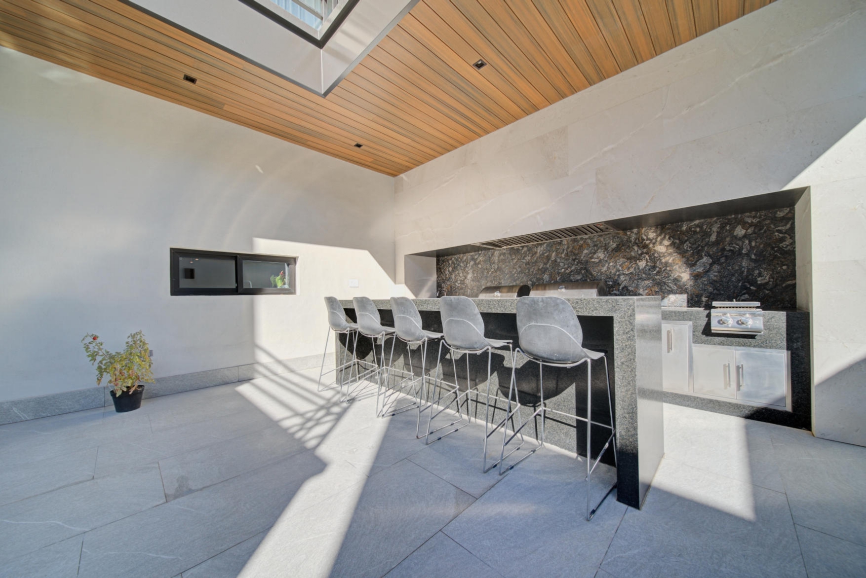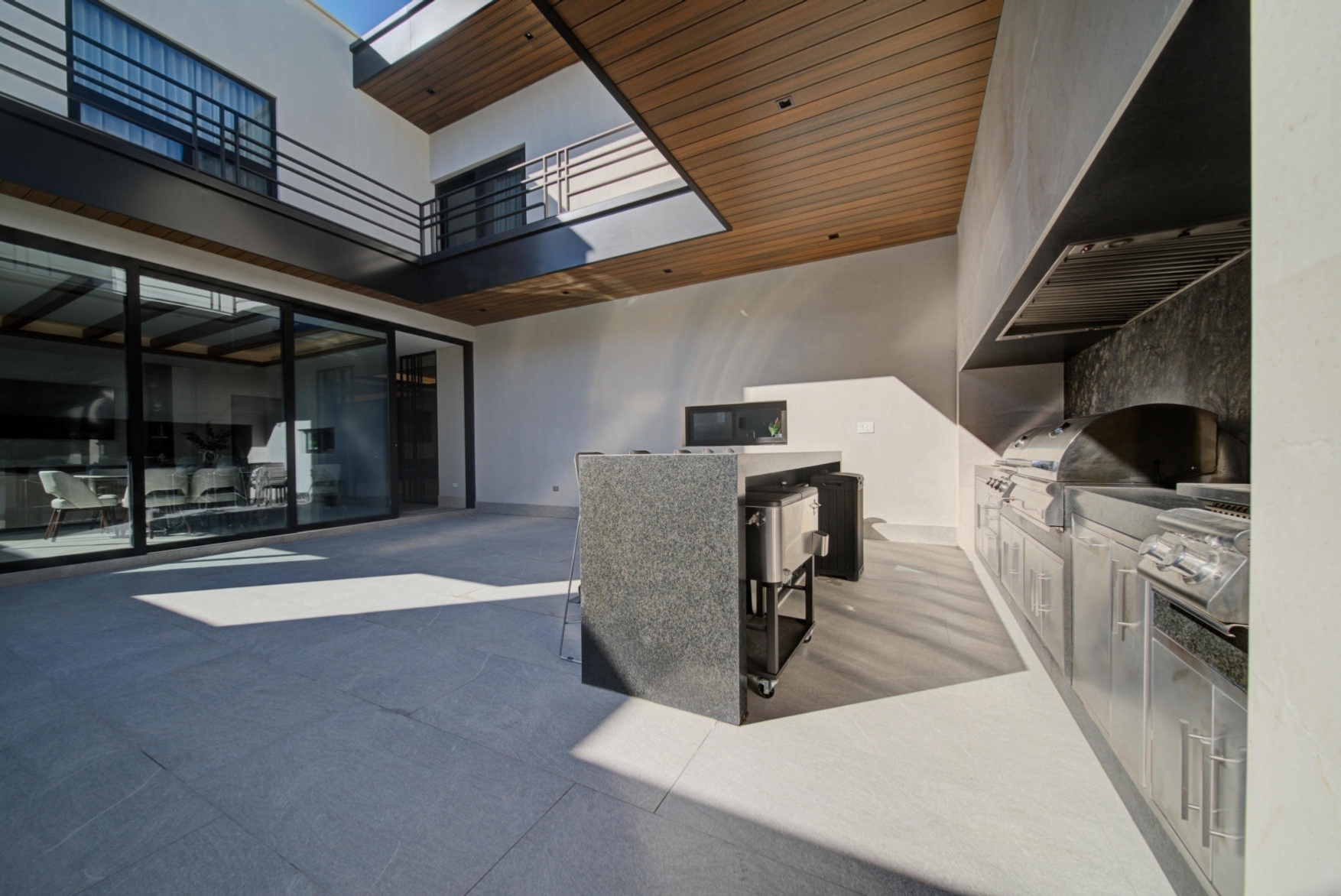 BBQ and entertainment area featuring gas grill, charcoal grill, stovetop, and professional-grade extraction system