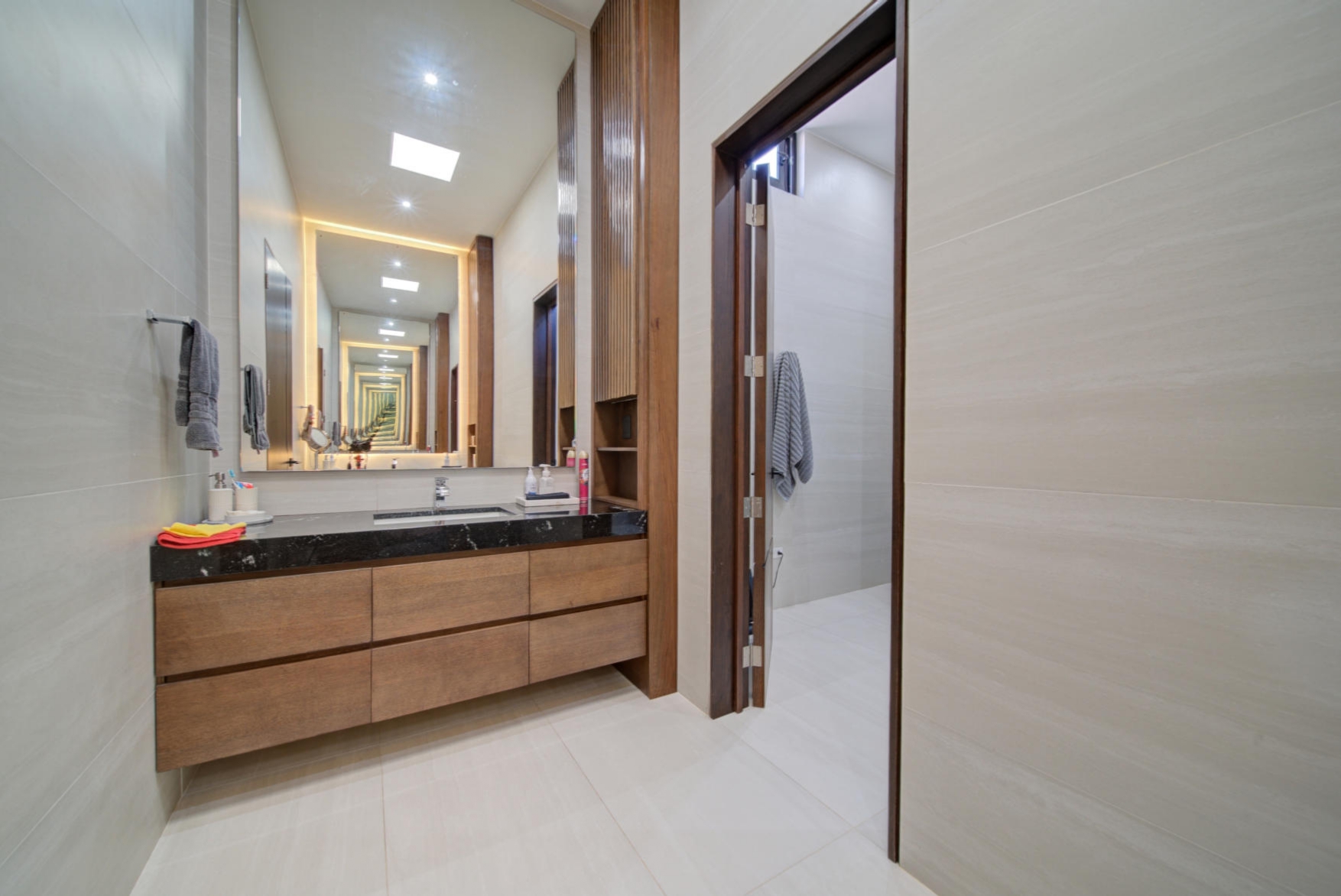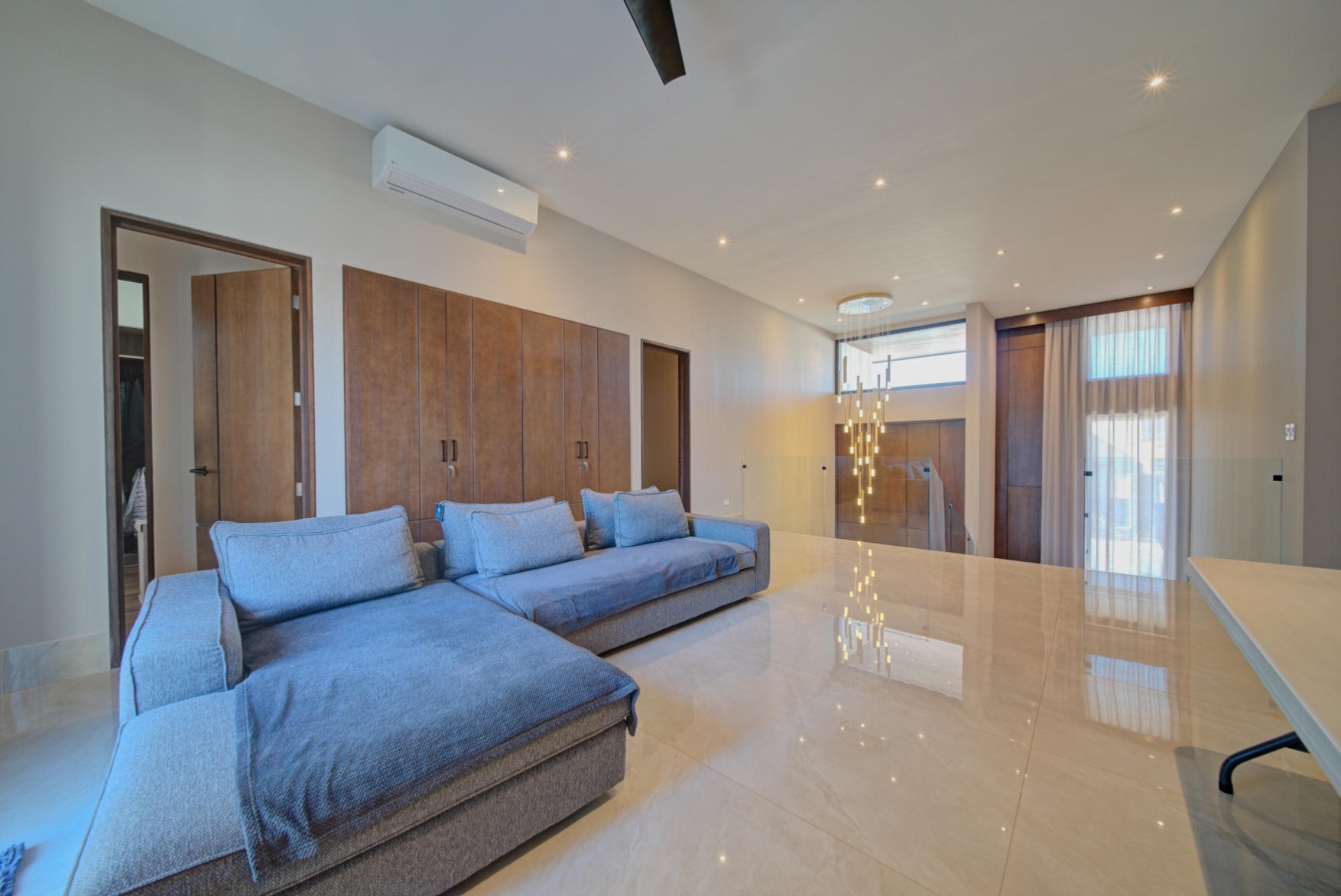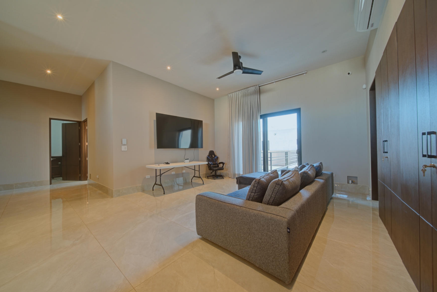 Large family living area with two linen closets with utility sink, ironing room, and a pleasant upper-level terrace